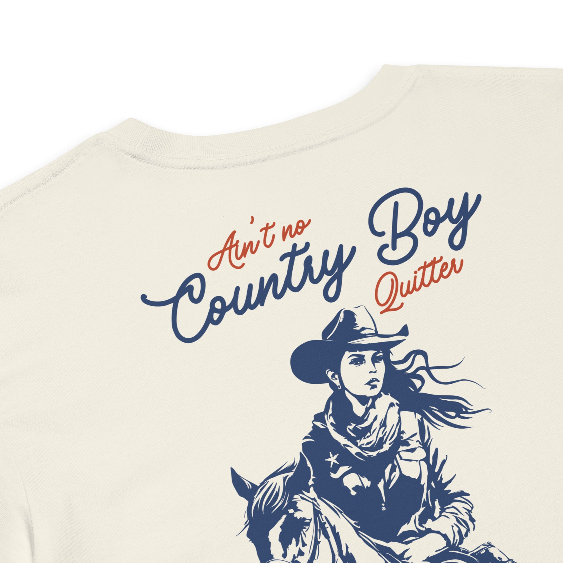 Featuring a bold, vintage-style cowgirl riding tall under the phrase “Ain’t No Country Boy Quitter,” this one’s for the ladies who go the distance. And just to make sure the message lands? A flirty lil’ “Git ‘er done” on the front chest—because she absolutely does. 😉